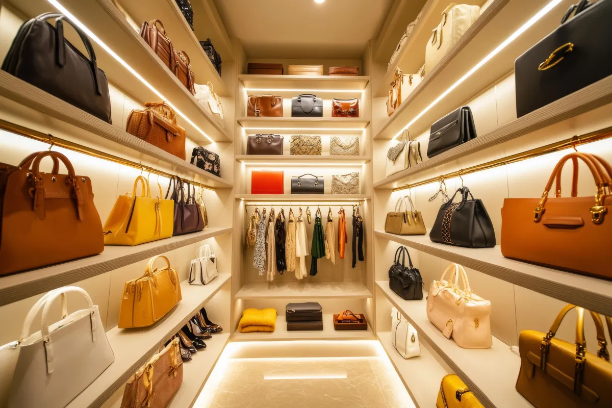 Islands, glass displays, LED mirrors, and seating nooks for boutique-level organization.