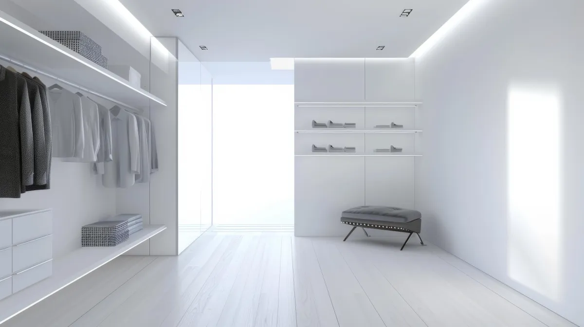 Warm LED strips integrated behind diffusers so garments glow without hotspots. Motion sensors available for hands-free elegance.